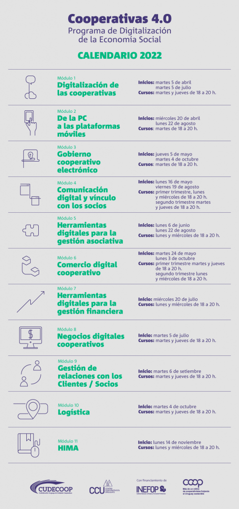 Los cursos se organizan en tres ejes temáticos: gobierno digital, negocios digitales cooperativos y digitalización de la administración cooperativa, y dentro de cada eje existen dos niveles para poder profundizar en la temática. Los cursos son virtuales, dos veces por semana, de 18h a 20h.