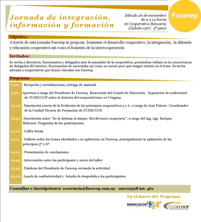 A través de esta jornada Fucerep se propone, fomentar el desarrollo cooperativo, la integración, la difusión y educación cooperativa así como el fomento de la intercooperación. Se llevará a cabo el sábado 26 de noviembre, de 9 a 14 horas en Cooperativa Bancaria.