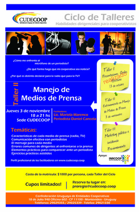 ¿Cómo me enfrento al micrófono de un periodista?¿Por qué es distinto hacer declaraciones para la radio que para un programa de tv?¿De qué forma hago que mi cooperativa sea noticia? Estas y otras preguntas estarán atendiendo los facilitadores Mariana Marenco y Daniel Cancela en el 2° Taller del Ciclo habilidades dirigenciales para cooperativistas, que tiene como eje central el tema “Manejo de medios de prensa. Énfasis en radio y TV”. Marenco es experta en comunicación estratégica y Cancela reconocido periodista con trayectoria en los medios de prensa nacionales. Vea más información a continuación. Los esperamos! Cupos limitados.