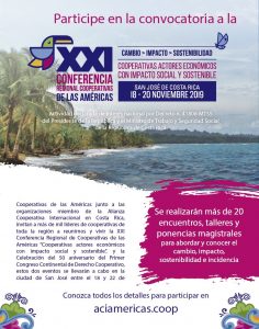 Invitamos a participar de la XXI Conferencia Regional de Cooperativas de las Américas y del 50 Congreso Continental de Derecho Cooperativo, que se llevarán a cabo seguidamente en San José Costa Rica del 18 al 20 de noviembre 2019 y del 20 al 22 de noviembre 2019.