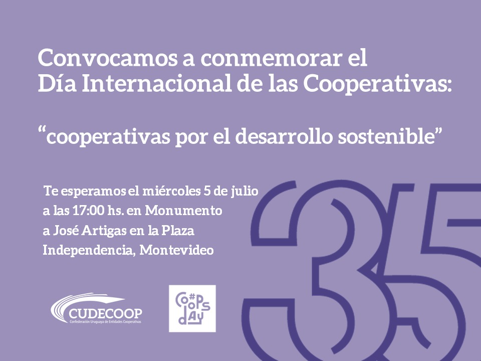 En el marco de las celebraciones por el día internacional de las cooperativas, te invitamos este miércoles 5 de julio a las 17h a compartir un espacio de reflexión y homenaje en el monumento a José Artigas de Plaza Independencia (Montevideo). Estarán presentes las autoridades del sector cooperativo quienes realizarán en este espacio sus planteos respecto a la necesidad de profundizar el reconocimiento del sector como palanca para el desarrollo sostenible.