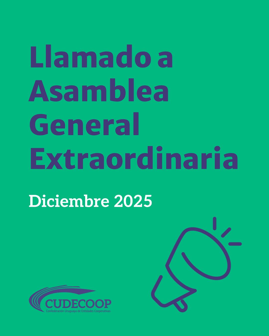 El Consejo Directivo de la Confederación Uruguaya de Entidades Cooperativas convoca a sus asociados a la Asamblea General Extraordinaria a realizarse el día 11 de diciembre de 2025 en la Sede de CUDECOOP ubicada en Av. 18 de Julio 948 oficina 502, Montevideo, en carácter exclusivamente presencial: