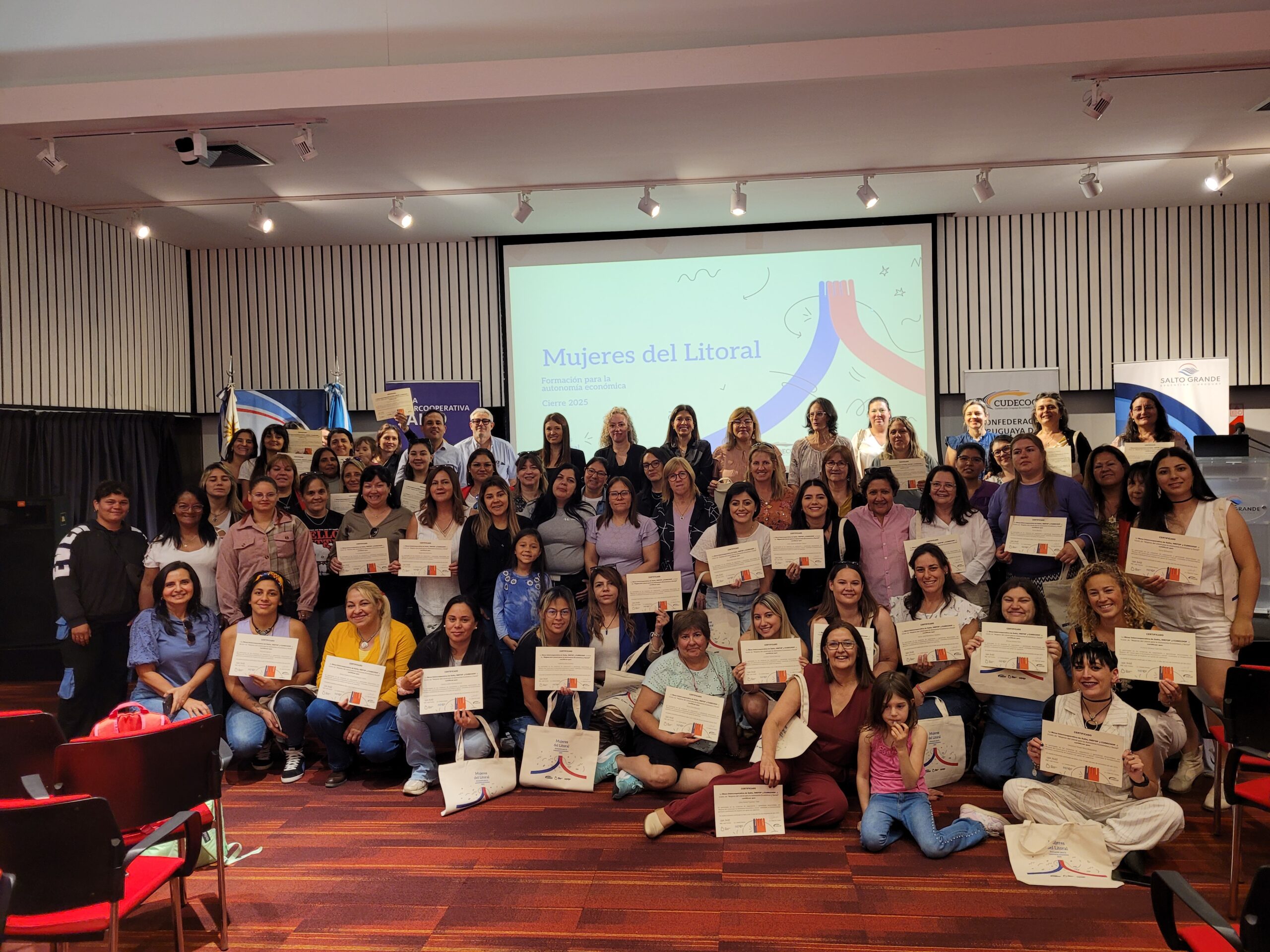 El sábado 15 de noviembre, en instalaciones de Salto Grande, mujeres de Artigas, Salto, Paysandú, Río Negro y Soriano recibieron su certificado de egreso del Proyecto Mujeres del Litoral: formación para la autonomía económica, una iniciativa de la Mesa Intercooperativa de Salto, financiada por el Instituto Nacional de Empleo y Formación Profesional (Inefop) y apoyada por la Confederación Uruguaya de Entidades Cooperativas (Cudecoop).